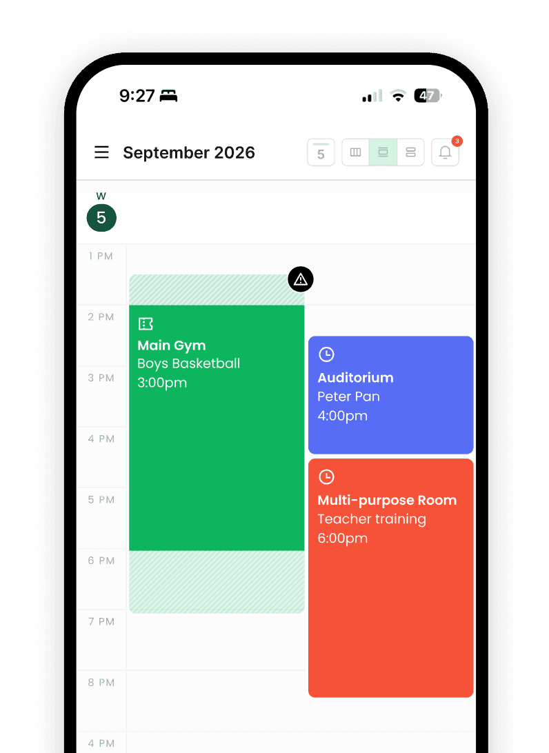 No more "is the gym free?" texts. See every space, every booking, and every conflict in one calendar — and route approvals without the email chain.