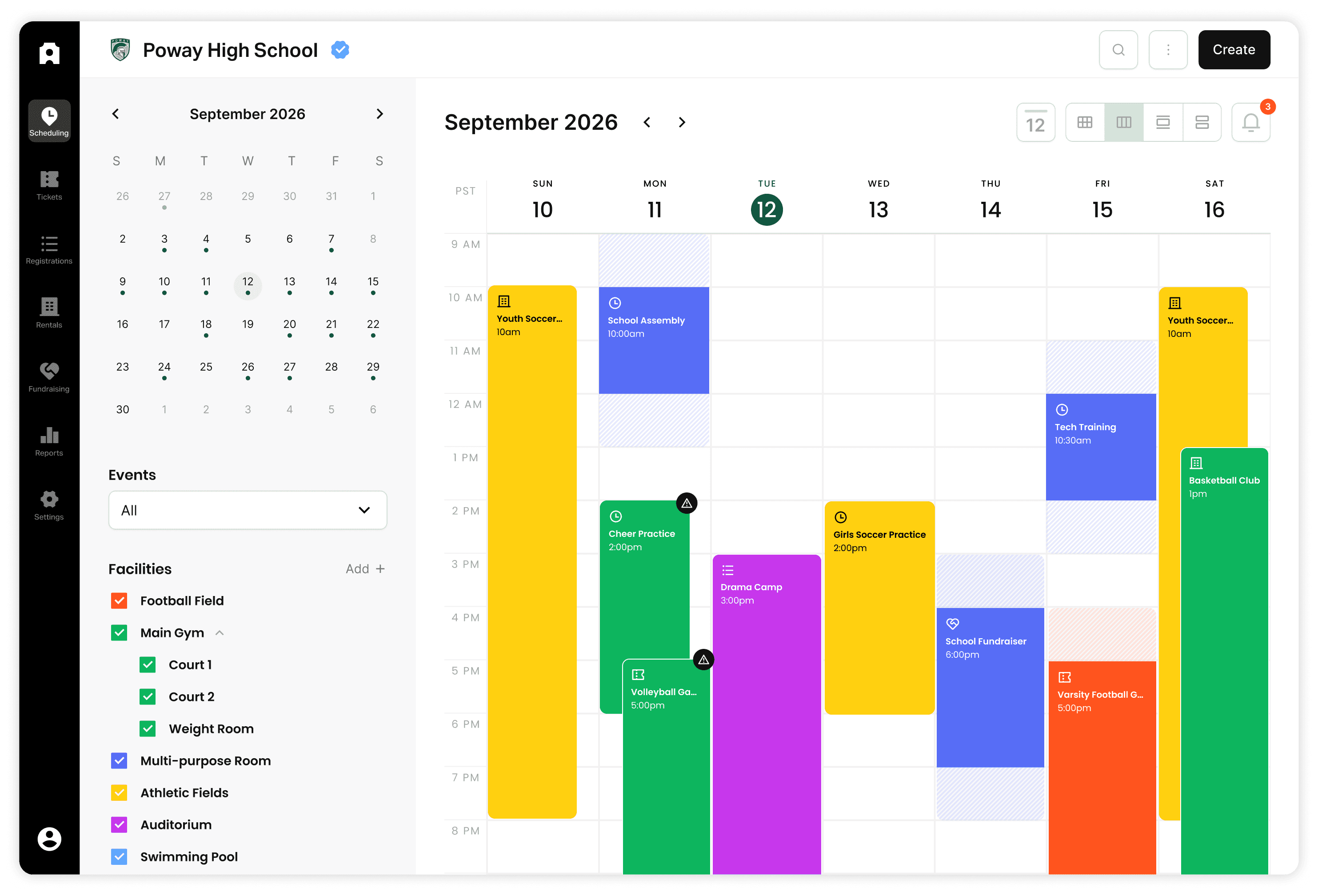 Athletic directors managing practices. Activities directors coordinating events and approvals. Facility managers juggling rentals and availability. Finance teams who need accurate numbers. Built for the people who don't have time for a complicated system.