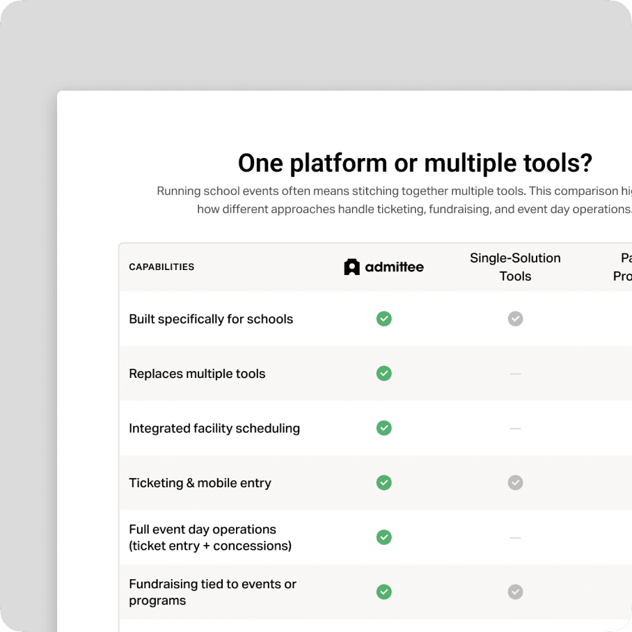 Admittee removes the hassle of multiple tools, bringing scheduling, ticketing, and fundraising together in one modern platform.