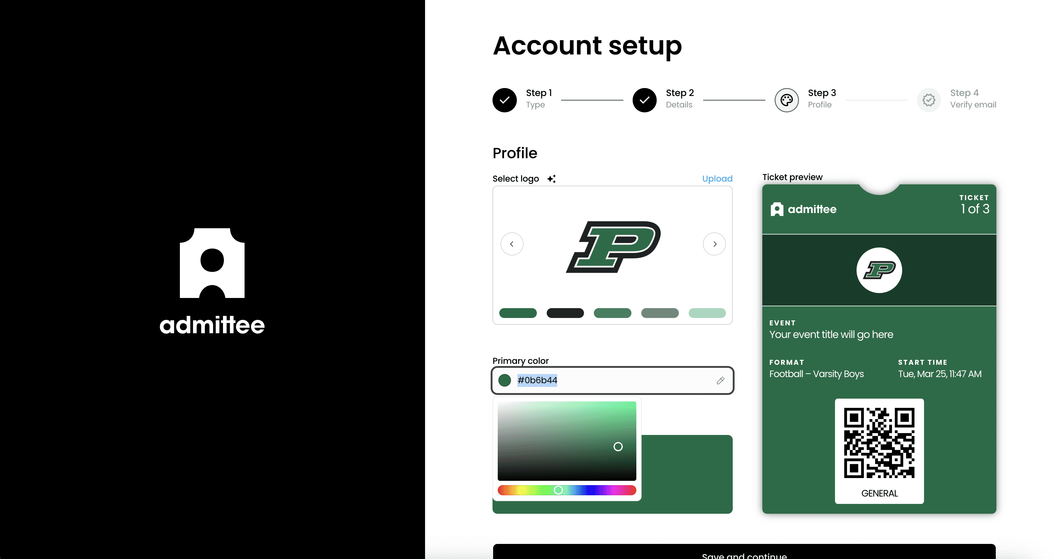 Make your event pages look on-brand! You’ll be able to select your primary colors to match your school’s branding. These colors will appear on your ticketing pages and promotional materials.
