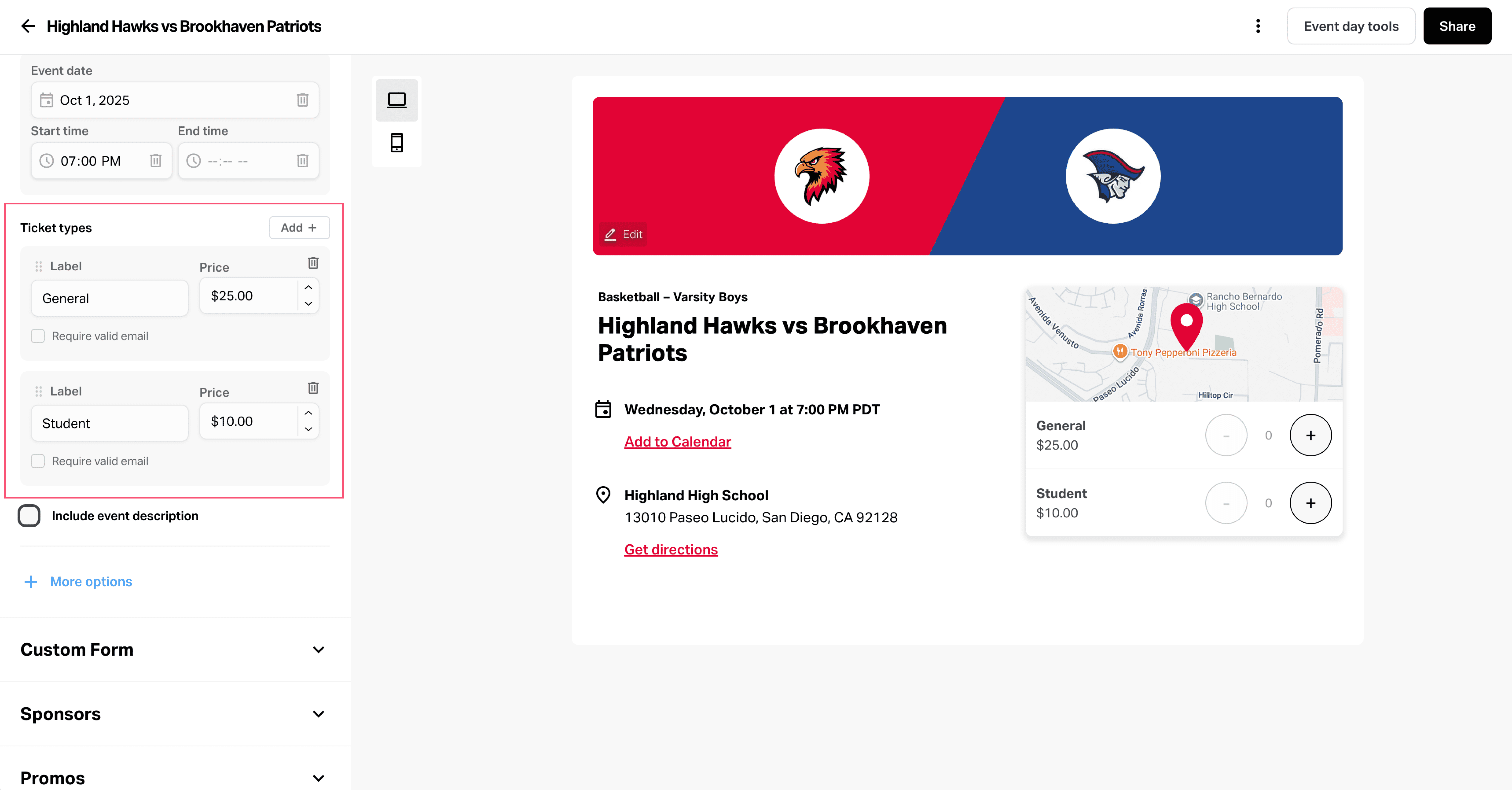 Add ticket types and pricing (e.g., Student $5, General Admission $10).