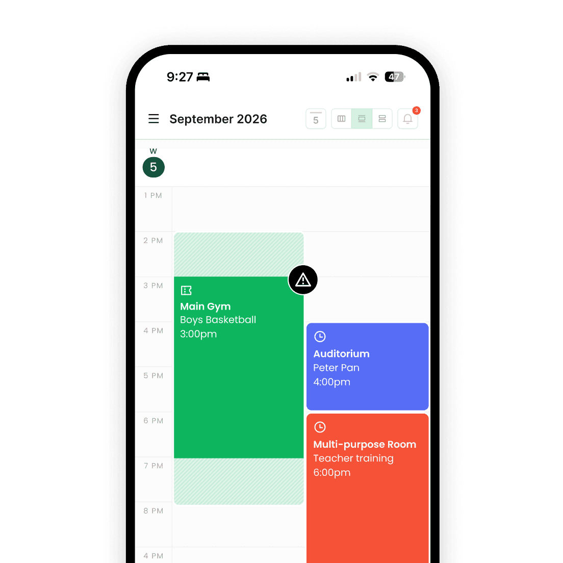 See every gym, field, room, and event in one clean calendar.