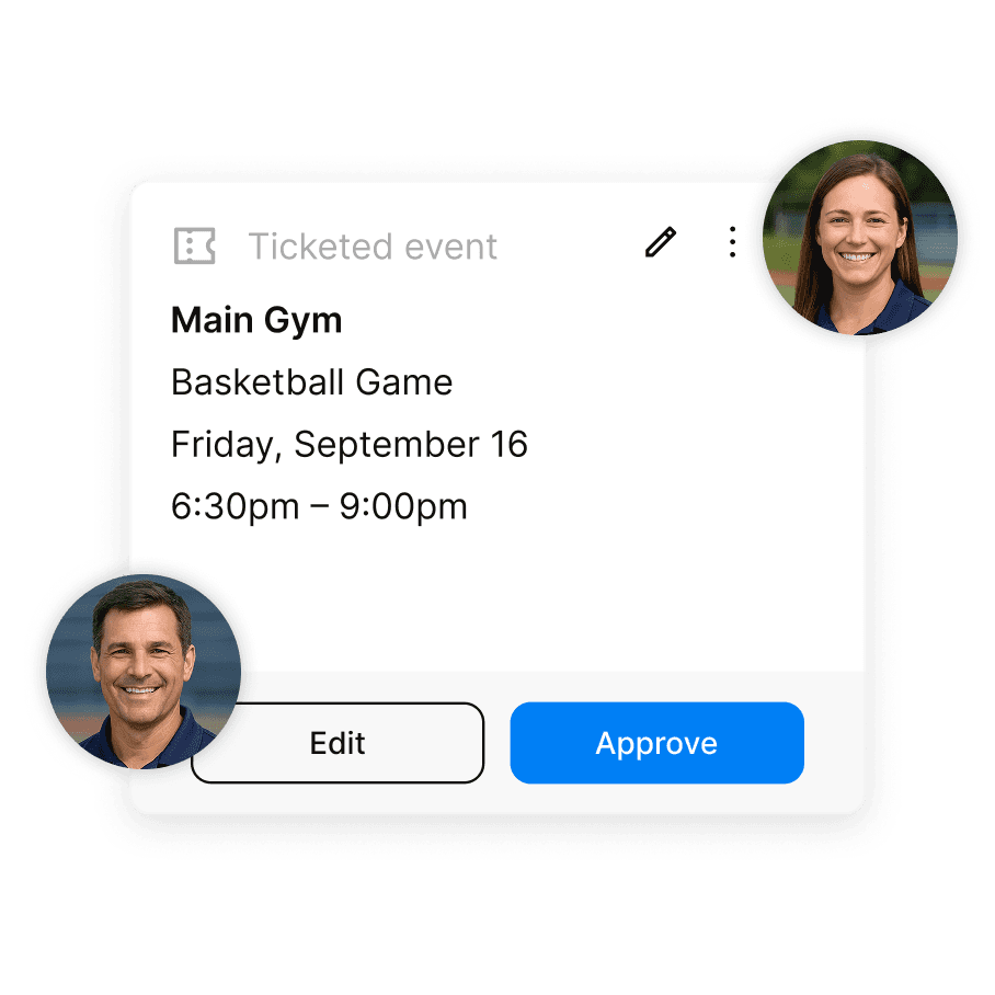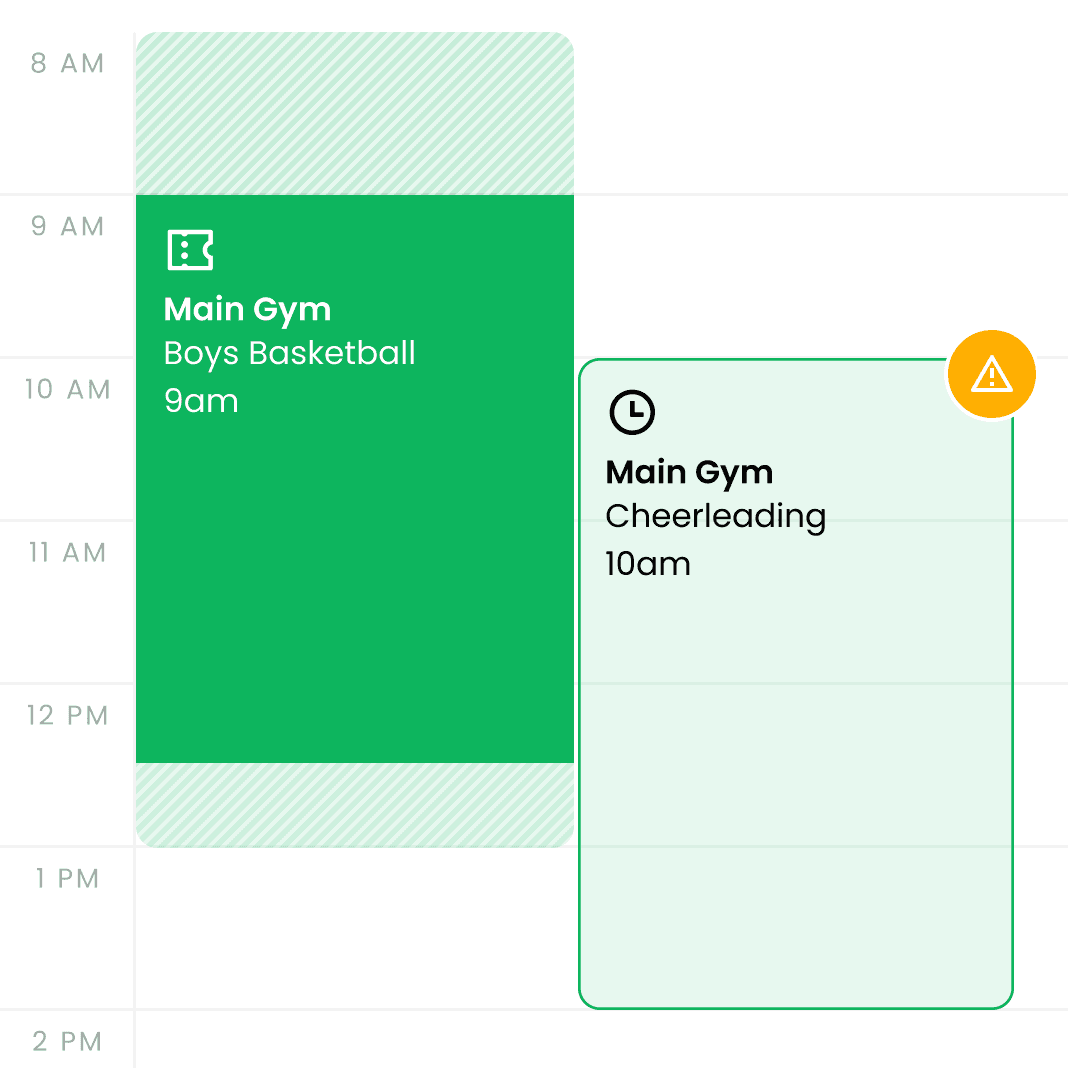 Admittee gives your team a shared calendar for every gym, field, and room — with built-in approvals, conflict prevention, and automatic notifications. Nothing gets double-booked. Nobody's left chasing updates.