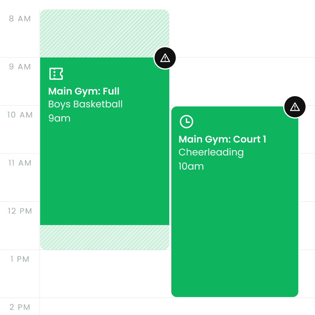 Admittee flags overlapping requests down to individual courts or rooms before they’re approved. Smart buffer times prevent back-to-back issues, and notifications keep staff informed whenever conflicts or changes arise.