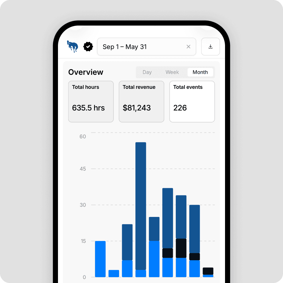 Track total hours, event counts, and revenue across all your facilities — by day, week, month, or custom range. Spot trends without building a single formula.