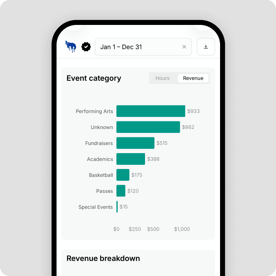 When payments are enabled, every dollar flows into reporting automatically — ticket sales, registrations, rentals, admission, and concessions. No manual matching, no separate tools, no end-of-month scramble.