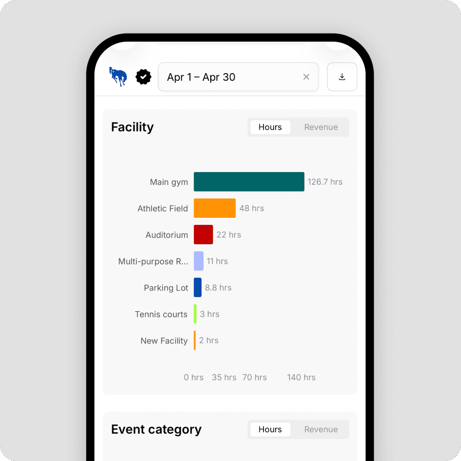 Understand how each gym, field, room, or court is being used. Compare total hours, event counts, and revenue across spaces. Spot underutilized facilities, justify budget requests, and make scheduling decisions based on real data — not gut feel.